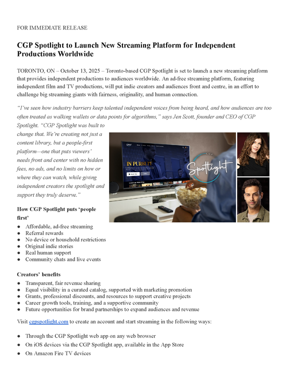 Toronto-based CGP Spotlight officially launches as a people-first, premium ad-free streaming platform built by filmmakers for filmmakers. The platform aims to put independent film and TV productions on the same level as major studio content, giving creators and audiences the experience they truly deserve.